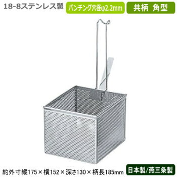 18-8ステンレス製パンチング木柄角型うどん揚げ 18-8ステンレス製パンチングパイプ柄角型うどん揚げ 18-8ステンレス製パンチング共柄角型うどん揚げ 【商品仕様】 ●サイズ/約外寸縦175×横152×深さ130×柄長185mm (パンチング穴径φ2.2mm) ●材質/18-8ステンレス製 ●日本製(新潟県燕三条製) ※メーカーに在庫がある場合は2-4営業日以内に発送させて いただきますが、稀に在庫がない場合もございますので、 お急ぎの場合はお問い合わせください。
