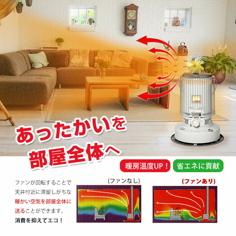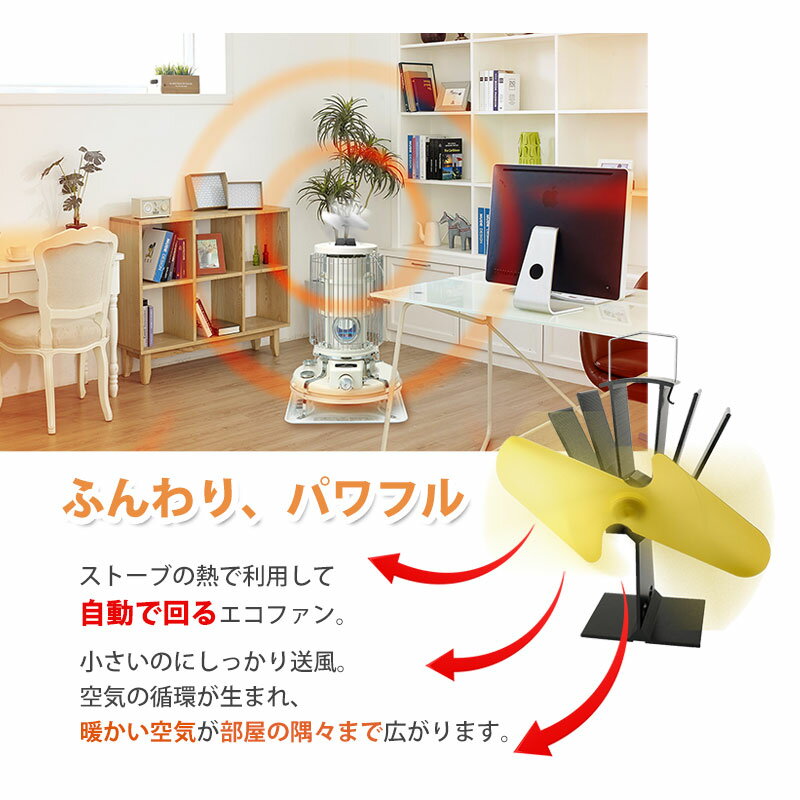効率的にお部屋を暖めたい方はこちらがおススメ 暖かい空気が部屋の隅々まで広がり暖房効率が高くなる、とってもエコなファンです ストーブの熱を使って自ら発電してファンを動かしますので、電池もコンセントも必要ありません。